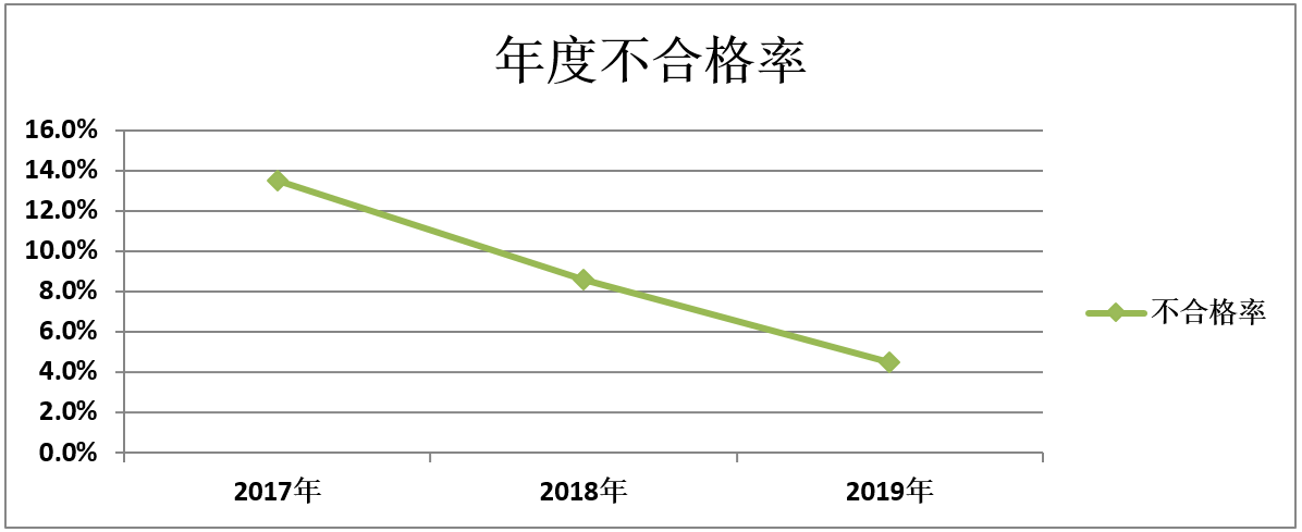 不斷修訂完善公司的《安全管理檢查考核辦法》和《公司現場管理制度》,每個月2次現場檢查考核,每季度召集車間主任以上參與現場檢查考核結果問題點審評,將考核成績和問題點公示在食堂大廳后面的看板上。組織相關部門對原2號車棚和西面臨時用地區域的臟亂差進行整治,重新規劃并劃分區域落實管理責任。賬票類檢查也落到實處,責任落到實處,處罰教育到位的原則,經過不懈努力,生產現場6S管理考核不合率從2017年的13.5%、2018年的8.6%,直至降至2019年的4.5%。